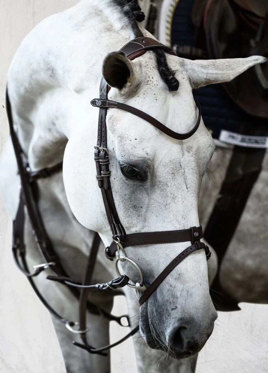 A stripped high function-bridle with a flat, simple noseband that has a completely removable flash strap discretely decorated with a PS badge. The hooks of which the bit attaches to have a transparent rubber cover in order to minimize the rattling that may occur between the metal. This is the perfect bridle for riders who often changes the bit since the simplicity of the hooks makes the bit-changing process very simple and efficient.