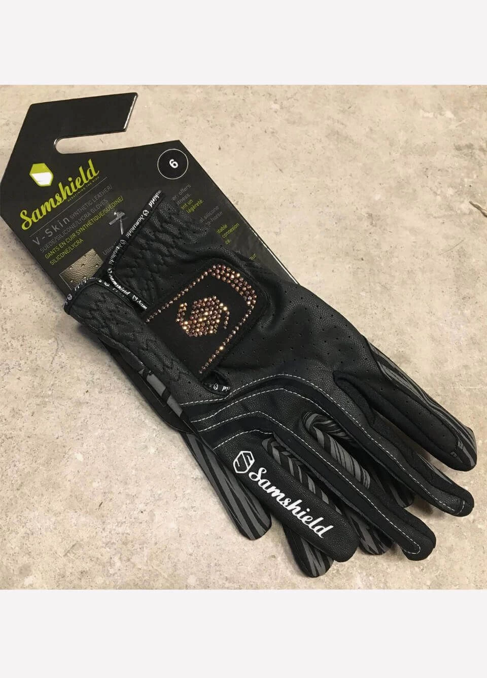The fastener of the Samshield V-Skin Swarovski Gloves is adorned with the Samshield logo in stunning Swarovski crystals.